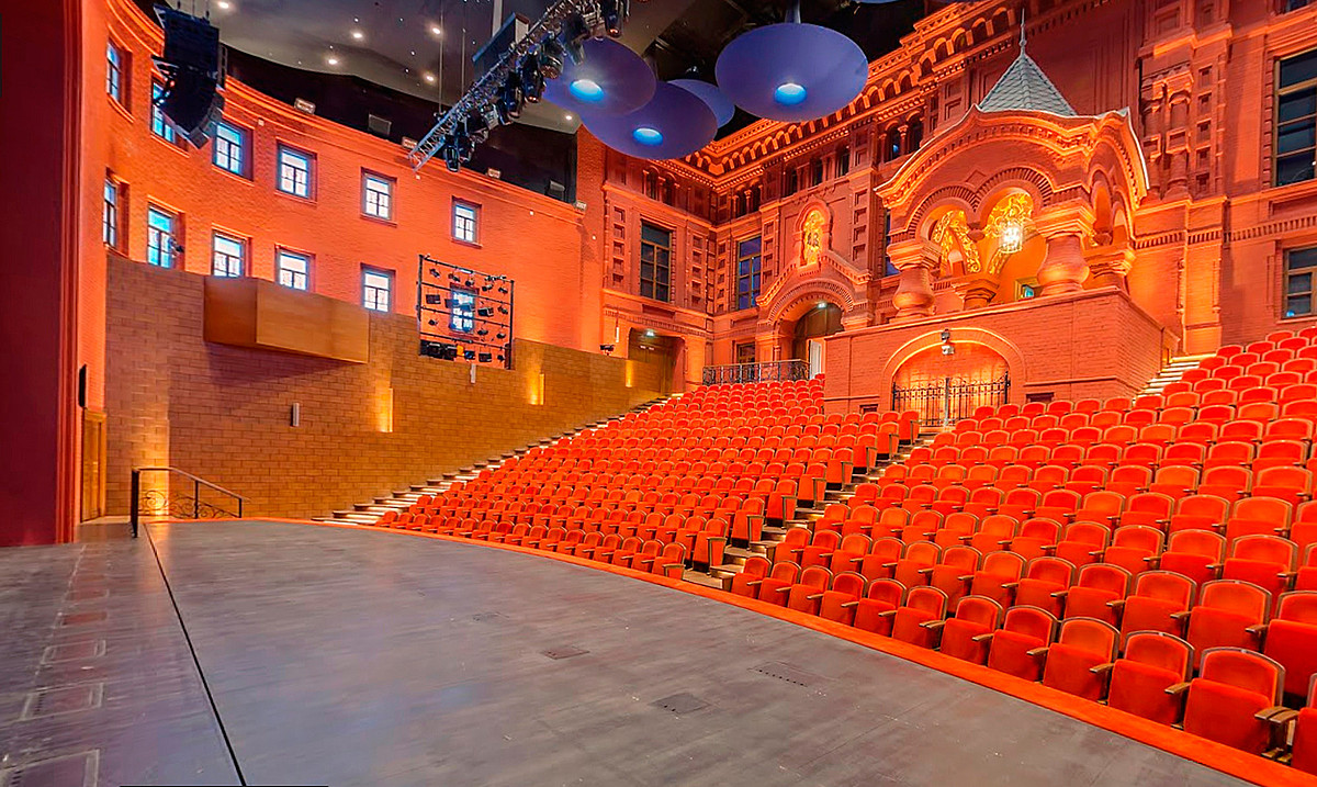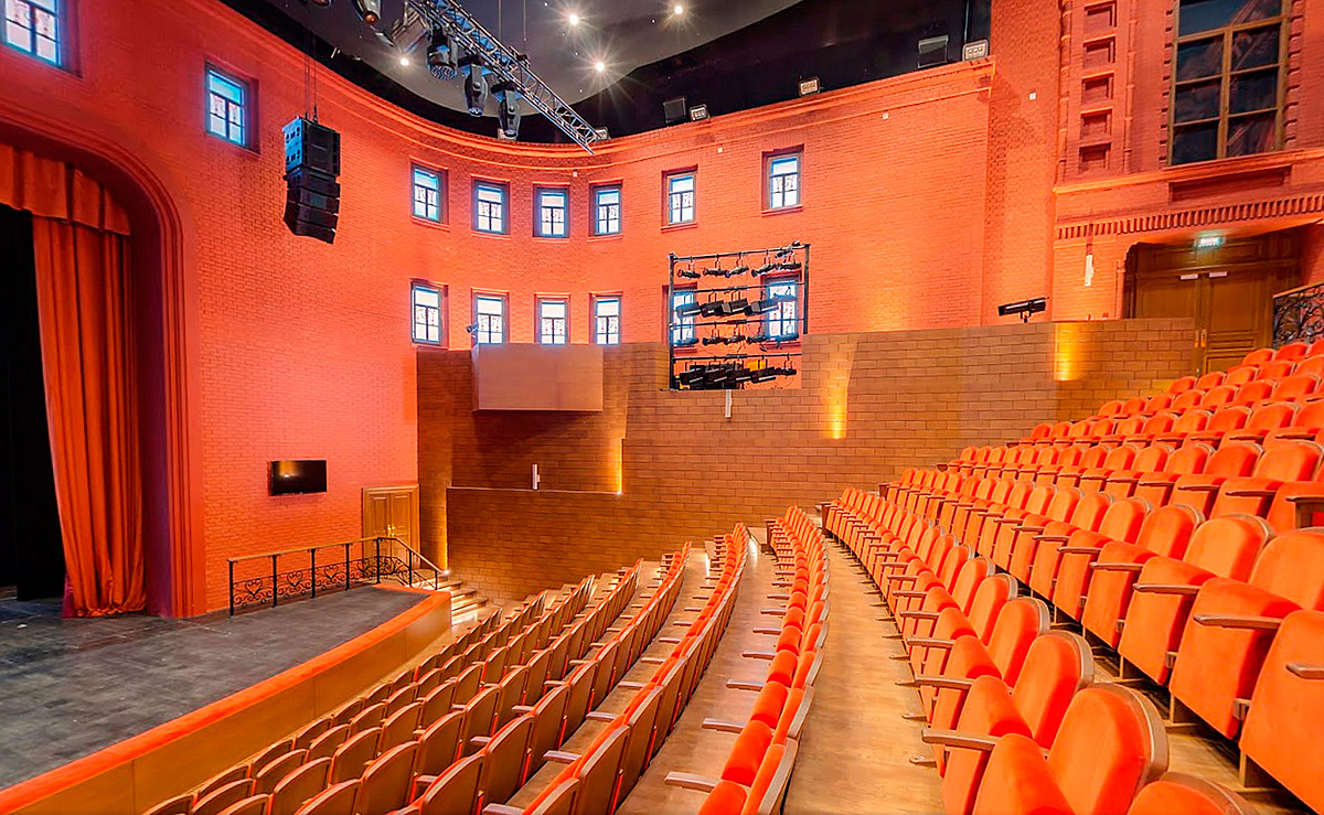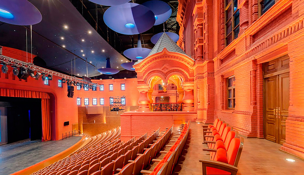 Внушительного размаха амфитеатр, окруженный старинными кирпичными фасадами, и царская ложа, бывшее красное крыльцо внутреннего двора усадьбы, равномерно освещены установленными по периметру светильниками IntiGROUND с углом луча 30°, а также прожекторами IntiRAY. Теплое белое освещение хорошо сочетается с кирпичной кладкой и натуральными деревянными поверхностями, создавая ощущение тепла и комфорта. Дополнительный световой акцент придают компактные светильники IntiSPOT, встроенные в проемы боковых стен, обитых массивом дуба. Полный комплекс работ по проектированию, поставке и монтажу освещения выполнила компания «Гармония Света». Презентация новой сцены состоялась в Москве 2 ноября 2015 года.