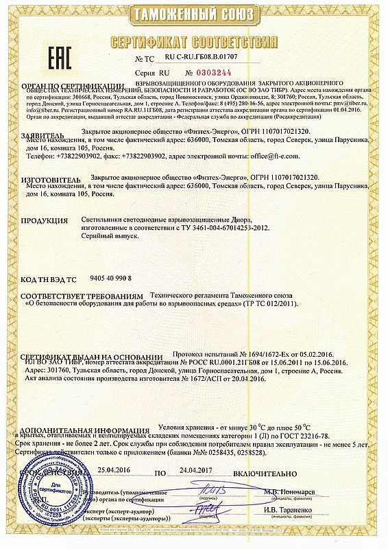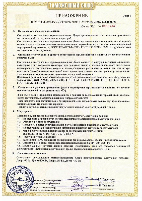 Взрывозащищенные светильники «Диора Ex» всех модификаций успешно прошли очередную сертификацию Таможенного союза. Полученные сертификаты подтверждают, что светильники полностью соответствуют всем требованиям, предъявляемым к оборудованию для работы во взрывоопасных средах, для жизни и здоровья людей. Сертификат взрывозащиты действителен до апреля 2017 года.