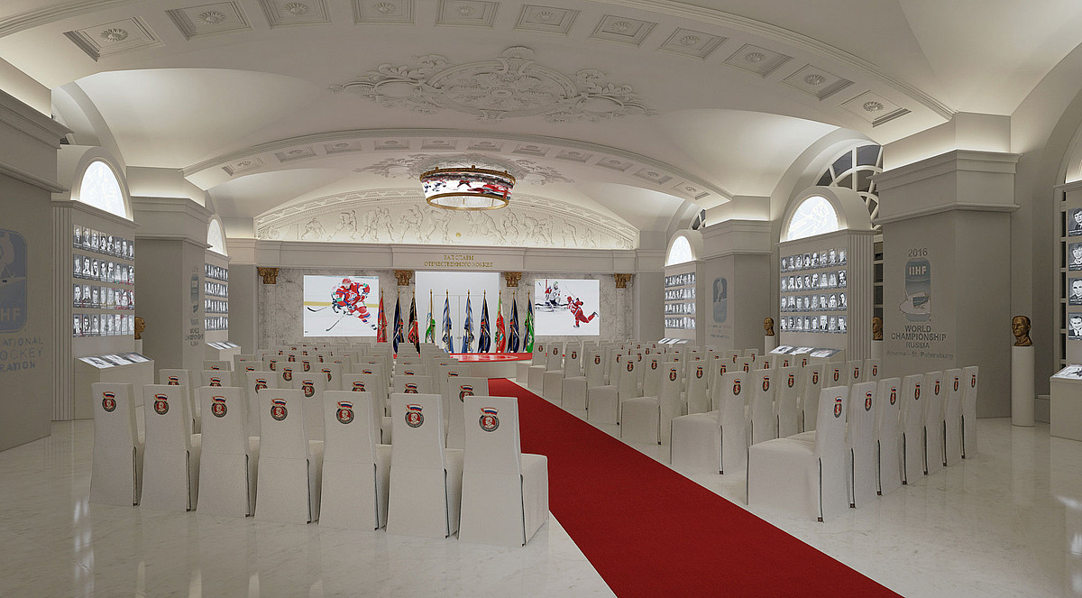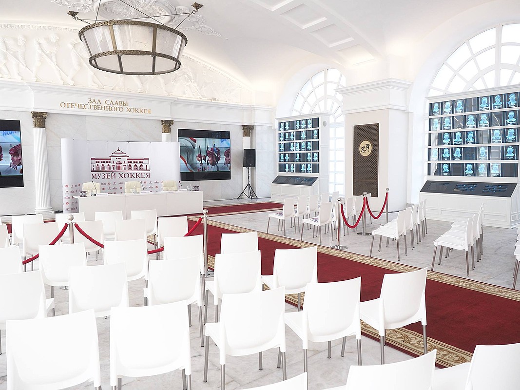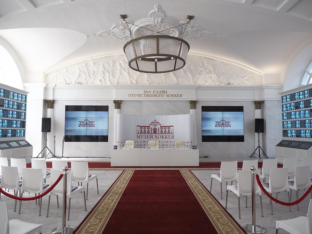 Оформление Зала выполнено преимущественно в стиле сталинского ампира — одного из лидирующих направлений в архитектуре, монументальном и декоративном искусстве СССР с середины 1940-х до середины 1950-х годов. Именно в это время хоккей зародился в нашей стране. Система освещения Зала предусматривает разноуровневую и функциональную подсветку. Закарнизное освещение и освещение барельефов выполнено с помощью компактных линейных светильников серии IntiSLIM. Нейтральный белый свет (4000 К) деликатно подчеркивает белые стены, своды и декоративные элементы, при этом сами светильники остаются незаметными.