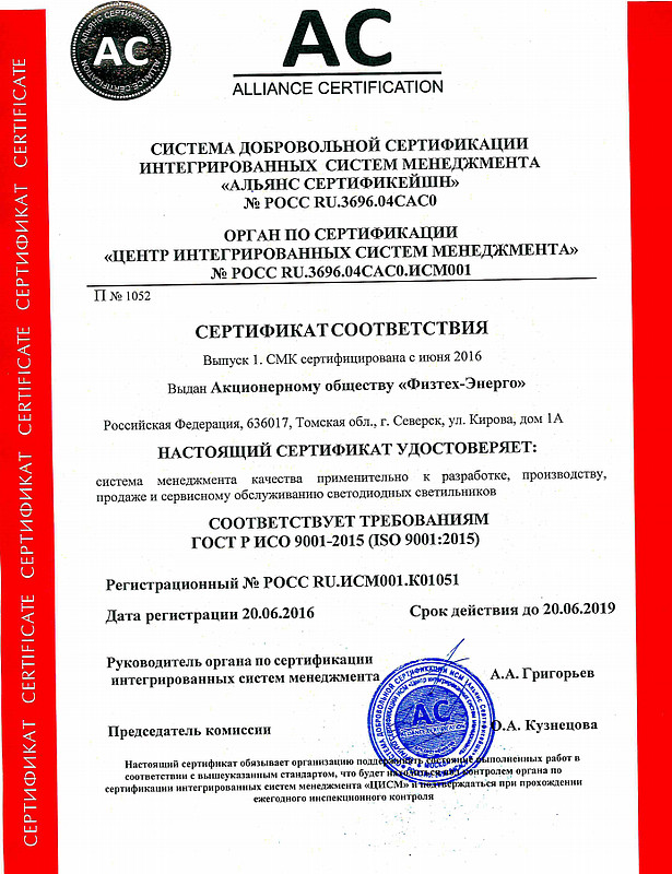 Решение о выдаче данного сертификата было принято сертифицирующим органом по итогам всестороннего аудита предприятия. Система менеджмента качества нашей компании была признана соответствующей требованиям стандарта ISO 9001:2015 в отношении проектирования, производства, продажи и гарантийного обслуживания светотехнической продукции (Регистрационный № РОСС RU.ИСМ001.К01051 от 20.06.2016).