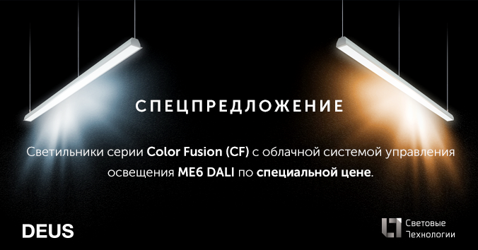 Компании «Световые Технологии» и DEUS запускают совместную акцию. Теперь, приобретая светодиодные светильники Color Fusion (CF), дополнительно вы получаете опцию –систему управления ME6 DALI.