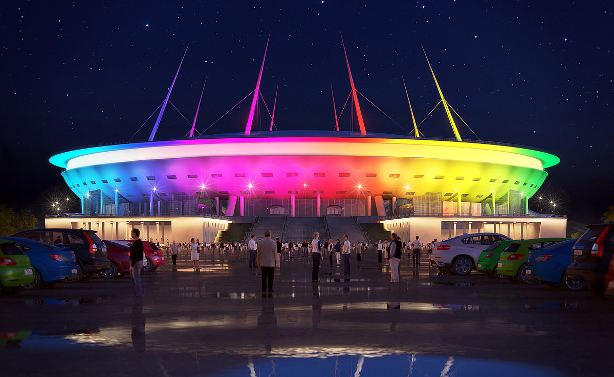 Временная система фасадных прожекторов, установленная в конце 2014 г., предусматривала освещение только чаши стадиона. Полная концепция включает также освещение козырька, шпилей и павильонов бывшего Кировского стадиона. Прожекторы серий IntiSTARK и IntiLINE с 30-градусной оптикой создают заливающее освещение чаши и козырька. В основании пилонов расположены узколучевые 5-градусные прожекторы серии IntiSTARK. Нижний ярус здания подчеркнут монохромными светильниками серии IntiLINE с овальной оптикой.