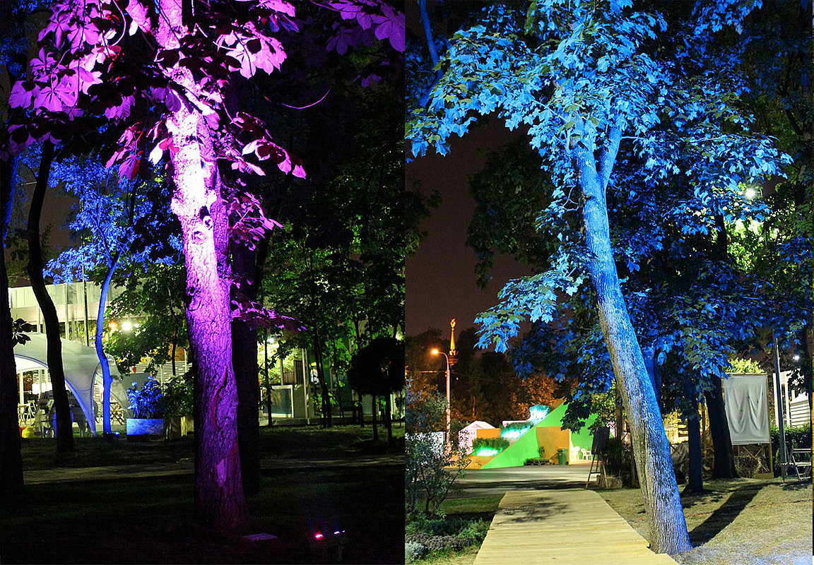 Благодаря предоставленному оборудованию IntiLED цветовая гармония воплотилась в жизнь. Ближе ко входу деревья освещены холодными оттенками – синим и голубым, переходящим в мадженту. По мере углубления в парк и приближения к теплому янтарному свету фонарей, цвет освещения деревьев также теплеет и принимает оттенки от зеленого, до оранжевого и красного. Таким образом, концептуальное освещение фестиваля выполняет не только эстетическую функцию, но и делит территорию на цветовые зоны, что позволяет легко ориентироваться в темное время суток.