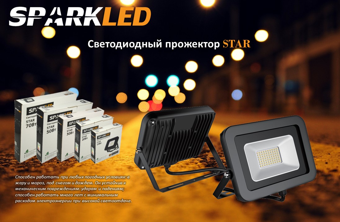 Светодиодный прожектор STAR, торговой марки SPARKLED, способен работать при любых погодных условиях: в жару и мороз, под снегом и дождем. Он устойчив к механическим повреждениям: ударам и падениям; способен работать много лет с минимальным расходом электроэнергии при высокой светоотдаче. Активно используется в освещении приусадебного участка, склада, промышленных территорий. Можно реализовать любые смелые решения для подсветки дома, гаража, витрин или вывесок магазинов.