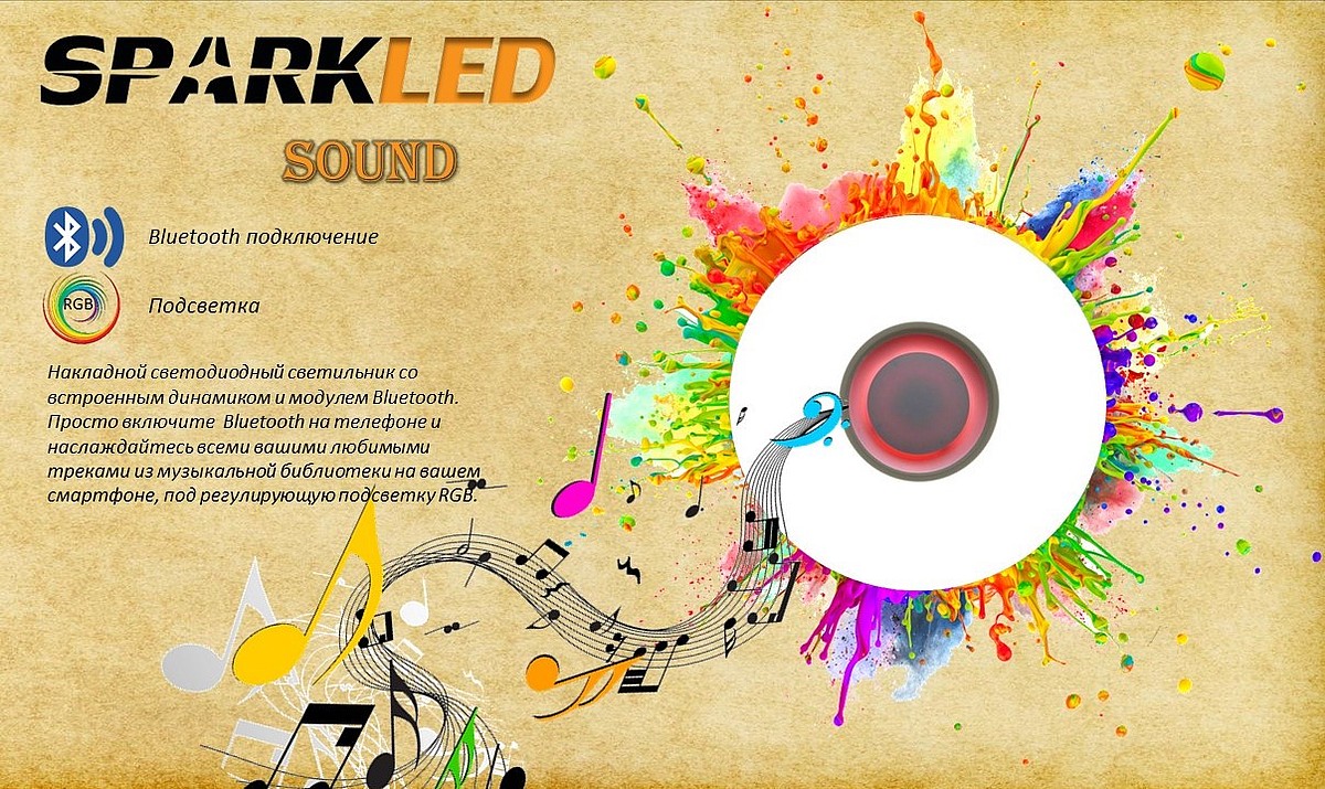Накладной светодиодный светильник SOUND, торговой марки SPARKLED. Светильник со встроенным динамиком и модулем Bluetooth. Просто включите Bluetooth на телефоне и наслаждайтесь всеми вашими любимыми треками из музыкальной библиотеки на вашем смартфоне. Функция Bluetooth и подсветка RGB, создают сказочную обстановку и настроение!