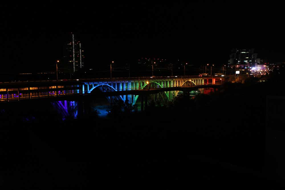 В повседневном режиме освещаются внешние фасады моста. В режиме выходного дня добавляется освещение нижней поверхности пролетного строения, что придает объемность сооружению и обогащает его вечерний образ.