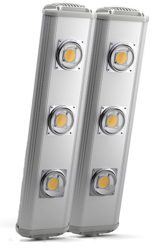 Светодиодный уличный прожектор на мощных матрицах для освещения магистралей, стадионов, строительных площадок. Укомплектован автоматической защитой, отключающей светильник при превышении значения входного напряжения выше 260 В либо подключении к сети 380 В. Источник питания светильника содержит защиту от его перегрева.