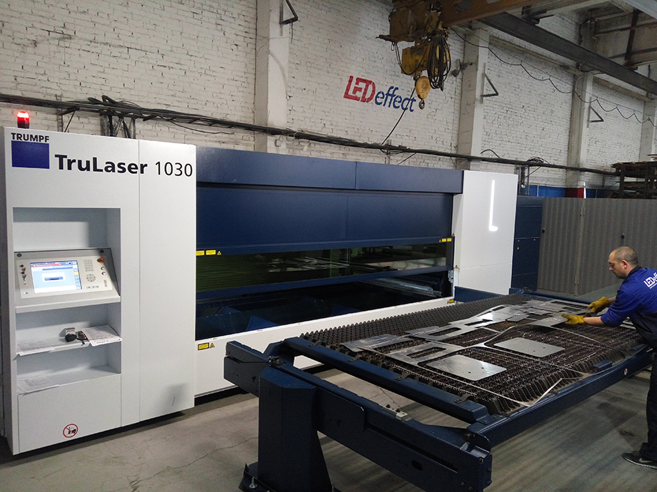 Компания ООО «ЛЕД-Эффект» сообщает о пополнении станочного металлообрабатывающего парка станком TRUMPF TruLaser1030 – это производительный компактный лазерный станок позволяющий быстро и точно вырезать необходимые детали из разных сортов листовой стали и алюминия.