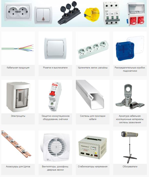 - широкий ассортимент (более 9000 позиций, 7 собственных торговых марок) высококачественной продукции (бытовые, промышленные, садово-парковые и офисные светильники, прожекторы, люстры, бра, лампы, ПРА, кабельные каналы, розетки, выключатели, вилки, разъёмы, кабельная продукция, удлинители, электрощиты, защитно-коммутационное оборудование, электрощиты, изоляционные материалы, системы заземления, вентиляторы, распределительные коробки, подрозетники и др.);