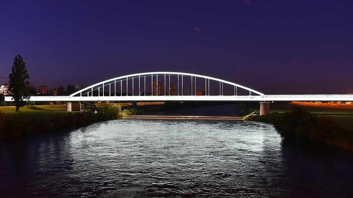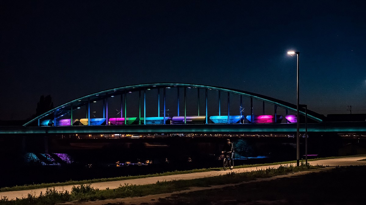 Philips Lighting работала над проектом архитектурного освещения моста совместно с известным хорватским дизайнером Дином Скира. Ночью мост освещается белым светом, акцентируя внимание на формах конструкции, пролетах и арке. Приближение поезда улавливается датчиками, и мост медленно погружается в темноту. Когда первый вагон выезжает на мост, по ходу его следования загораются вертикальные разноцветные световые полосы, которые проецируются на проходящий поезд и устраивают над водой настоящее шоу, достойное импровизаций самого Джими Хендрикса. Белый сценарий освещения моста снова включается, когда поезд проезжает.