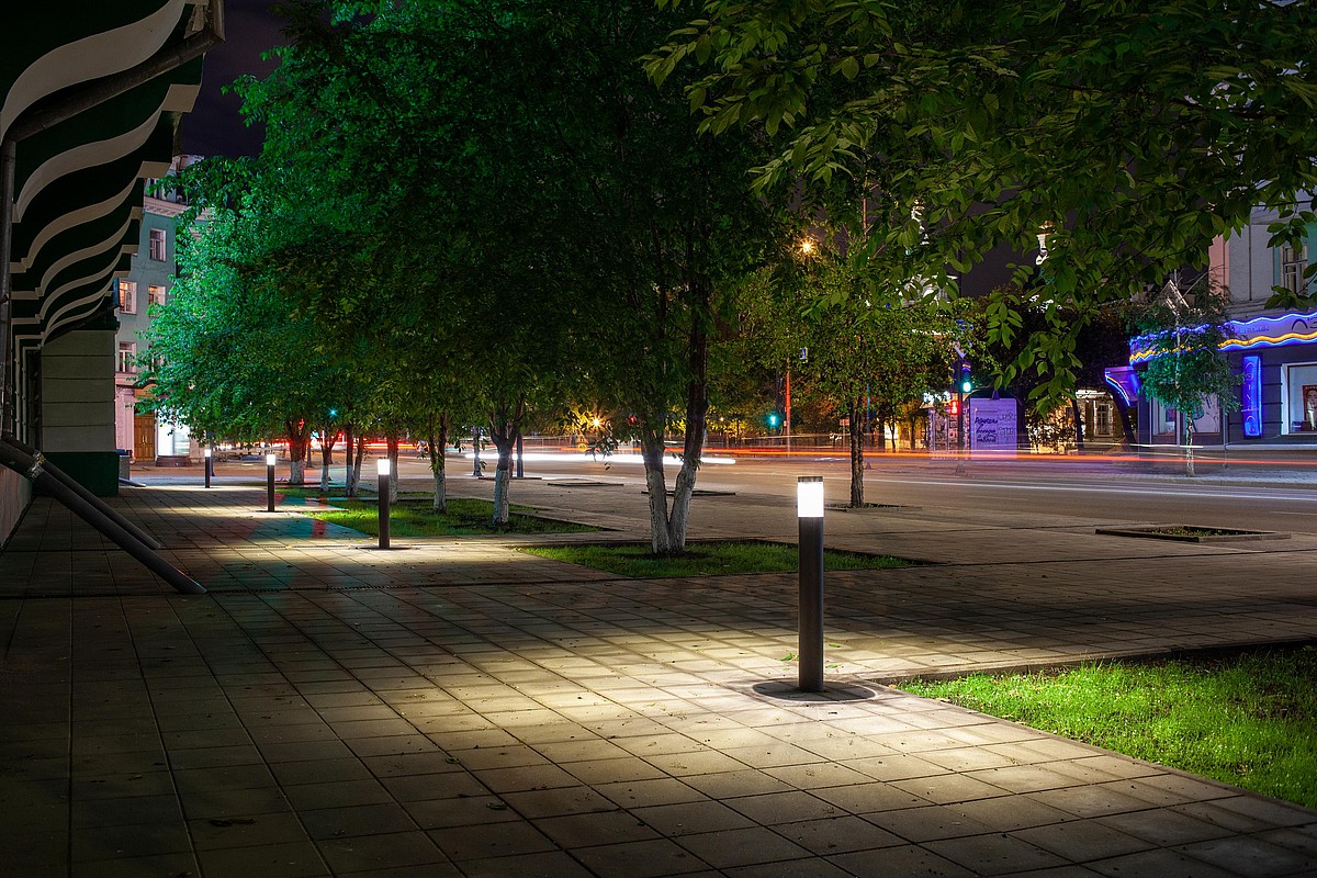 В-третьих, в отдалении от дороги установлены болларды, LV-BOLLARD ROUND, высотой один метр. Они не просто заливают пространство светом, а подсвечивают тротуар на уровне ног.