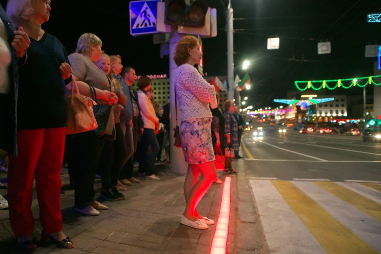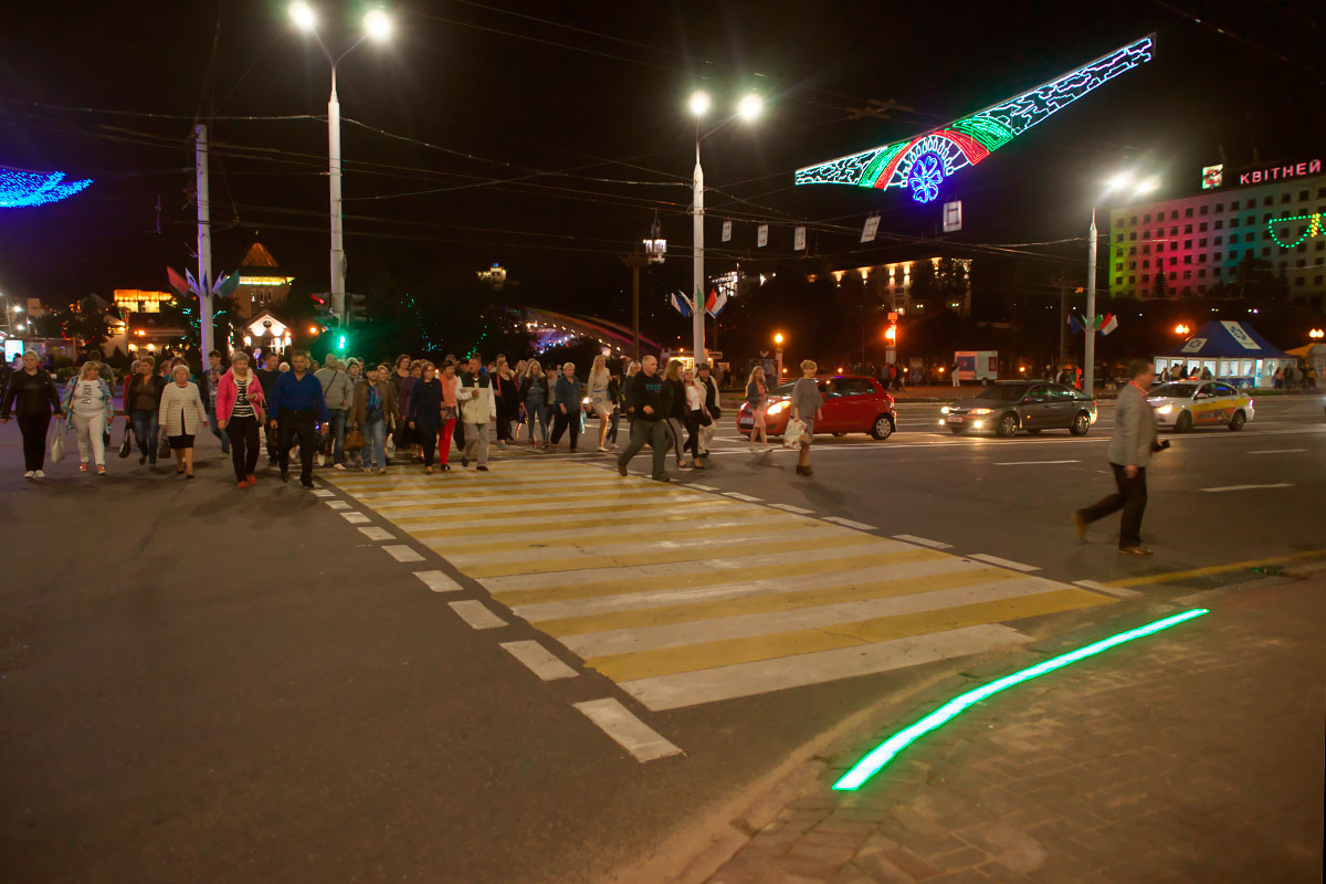 Две четырехметровые светящиеся линии размещены на тротуарах по обеим сторонам улицы и обозначают вход на «зебру». Светодиодные плитки синхронизированы со светофорами, они могут светиться красным и зелёным светом, а также мигать перед сменой сигнала. Тендер на установку этого дополнительного технического средства организации дорожного движения на пешеходных переходах площади Свободы выиграло минское частное строительно-торговое унитарное предприятие «ИнтэкЭлектро», финансируется она из местного бюджета.