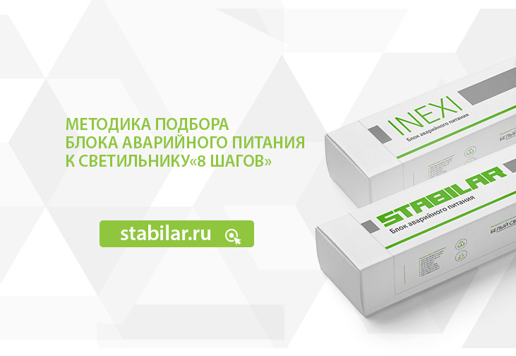 Представляем вашему вниманию удобный конфигуратор по подбору блоков аварийного питания от экспертов компании «Белый свет» - stabilar.ru. В случаях, когда для организации аварийного освещения требуется сохранить единый дизайн и концепцию освещения, когда организовать аварийное освещение требуется на уже установленных на объекте светильниках - специалисты компании «Белый свет», рекомендуют использовать блоки аварийного питания STABILAR®, INEXI®. Блок аварийного питания (БАП) позволяет светильнику дополнительно к функции рабочего освещения выполнять функцию аварийного освещения.Разнообразие источников света представленных на современном светотехническом рынке, конструктивные особенности самих световых приборов требуют использования различных блоков аварийного питания, в зависимости от исходных технических характеристик и стоящих задач. Специалисты компании «Белый свет» разработали методику подбора БАП к световому прибору «8 ШАГОВ», которая позволит качественноподобрать блок аварийного питания к любому светильнику с учетом стоящих перед Вами задач. Для этого Вам потребуется сделать восемь шагов, которые представлены в таблице №3 каталога «Блоки авариного питания STABILAR-2, INEXI-2» (стр.11) или воспользоваться удобным конфигуратором подбора на сайте stabilar.ru.