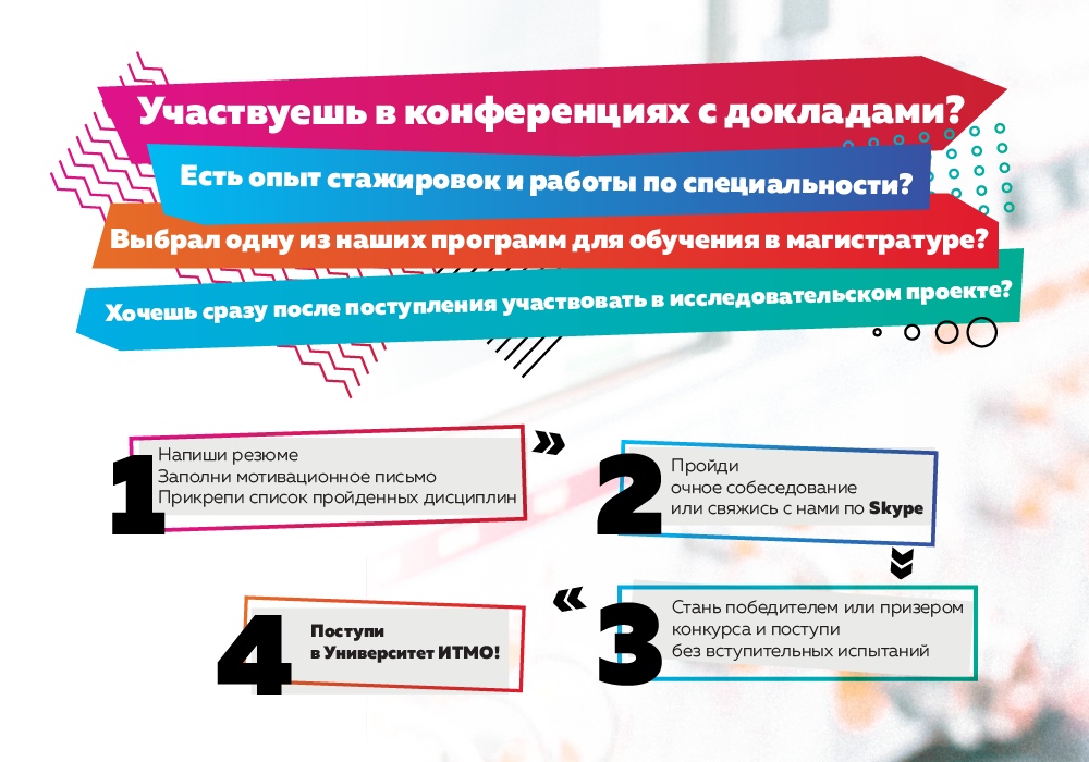 Победители конкурса, набравшие в сумме за портфолио и собеседование 100 баллов, будут зачислены на магистерскую программу без вступительных испытаний. Подробности и условия участия: https://abit.ifmo.ru/page/172/.