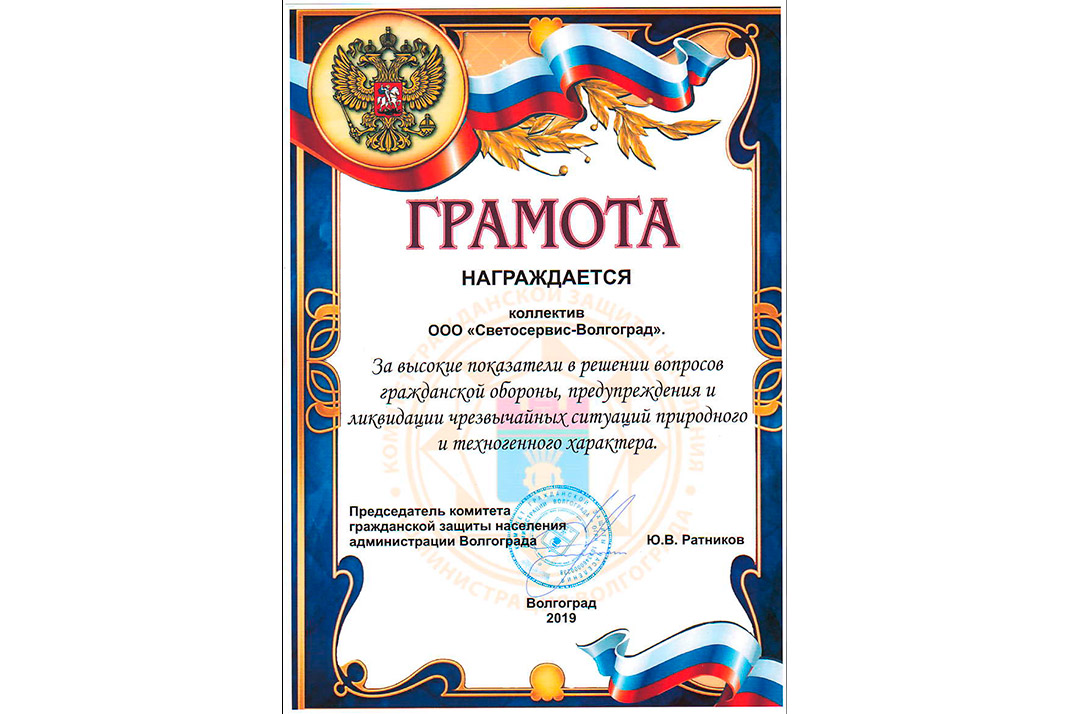 Коллектив компании «Светосервис-Волгоград» был награждён грамотой от Комитета гражданской защиты населения Администрации Волгограда. В тексте документа отмечены заслуги компании – «высокие показатели в решении вопросов гражданской обороны, предупреждения и ликвидации чрезвычайных ситуаций природного и техногенного характера».