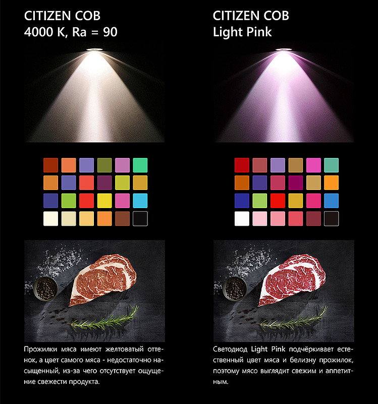 Таким образом светодиоды VividCOB Light Pink подчеркивают красный цвет мяса и при этом прожилки остаются белыми.