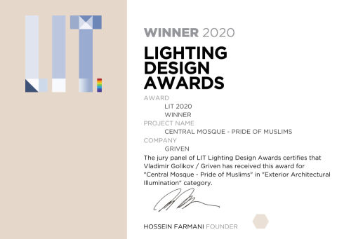Проект архитектурно-художественного освещения Центральной мечети "Гордость Мусульман" в городе Шали (Чеченская Республика) стал победителем международной премии LIT Lighting Design Awards 2020 в номинации Exterior Architectural Illumination (наружное архитектурное освещение).