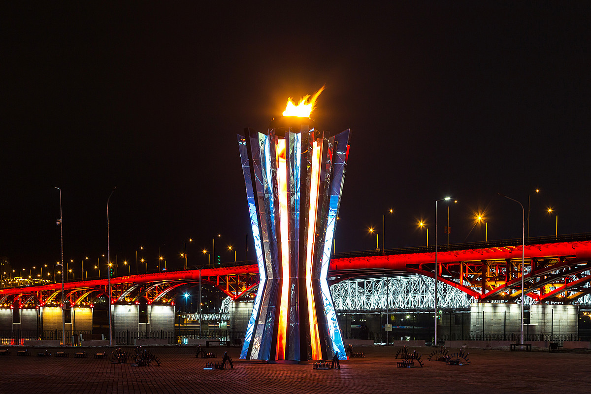 Для медиаэкрана разработали 2 сценария. Первый сценарий олицетворял основные цвета универсиады, а второй создавал имитацию огня. Далее мы с коллегами из Красноярсккрйгаз синхронизировали включение второго сценария и зажигание газа, который в последствии зажигал огонь на верхушке чаши.