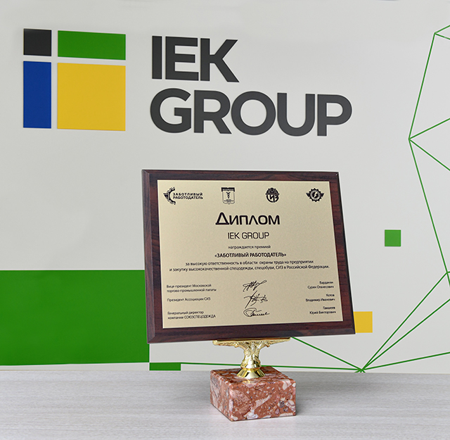 В апреле 2021 года в Москве состоялась церемония вручения премии «Заботливый работодатель». IEK GROUP получила диплом «за высокую ответственность в области охраны труда на предприятии и закупку высококачественной спецодежды, спецобуви, СИЗ в Российской Федерации».