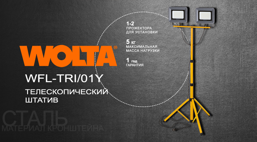 Компания WOLTA® представила телескопический штатив для установки прожекторов при временном освещении помещений и открытых пространств, а также соединительный кабель с гермовводом (гермоввод можно приобрести отдельно).