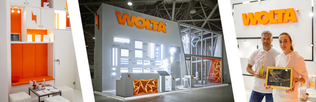 Стенд. Идя в ногу со временем, WOLTA® разработала стенд в стиле минимализм, воодушевляясь принципами объединения функционализма и современных тенденций, а также сочетанием простоты форм и цветов. Вдохновляясь работами таких дизайнеров, как Бен Стормс и Дитер Рамс, наша команда воплотила в жизнь самые интересные дизайнерские решения, например, объемные фигуры со светодиодной подсветкой на стойке ресепшена и стене шоу-рума. Выбирая основные цветовые решения, компания остановилась на белом цвете, что добавило лёгкость и воздушность всей конструкции, а новый корпоративный оранжевый цвет придал законченный вид всему стенду. Огромная вывеска логотипа на стенде действительно выглядела впечатляюще и была видна с расстояния 10 метров. Также компания не забыла и про новый корпоративный знак — молнию, которая встречала гостей с торца стенда. Открытая зона с техническим светом плавно перетекала в крытый шоу-рум с декоративным освещением, в котором ярким акцентом стала дизайнерская люстра из светильников WOLTA®Pro. В дополнение всей концепции, в шоу-руме были представлены магнитные трековые системы направления WOLTA®Decor и световые кубы, в которых был презентован концепт новой упаковки продукции.