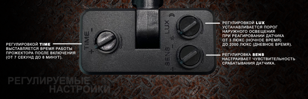 Регулировкой TIME выставляется время работы прожектора после включения (от 7 секунд до 8 минут). Регулировка SENS настраивает чувствительность срабатывания датчика.