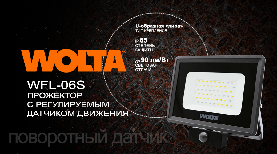 Компания WOLTA презентовала новый LED-прожектор серии WFL-06S. Дизайн и конструкция светильника были полностью изменены с учётом встроенного поворотного датчика движения, нового алюминиевого антикоррозийного корпуса, а также видоизменённой крепёжной U-образной «лиры» для установки на твёрдую поверхность.