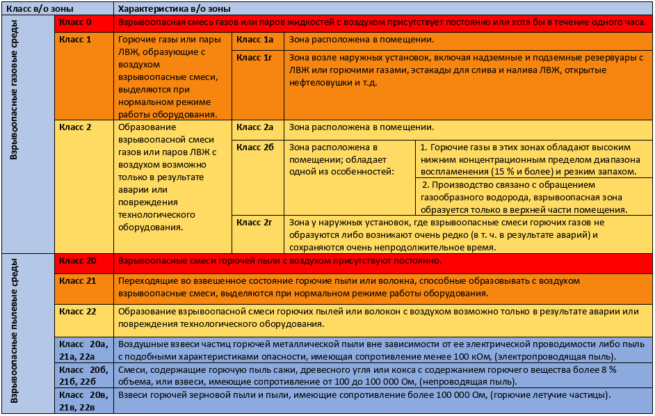 Классификация взрывоопасных зон прописана в Техническом регламенте о требованиях пожарной безопасности (Федеральный закон N 123-ФЗ) и в действующем СП 42 3.1325800.2018. Класс взрывоопасности присваивается зоне в зависимости от того, как часто и как долго там присутствует взрывоопасная смесь. Также класс зависит от типа взрывоопасной среды: газо- и паровоздушные среды создают зоны классов 0, 1, 2, а пылевоздушные – зоны классов 20, 21, 22. У некоторых классов есть подвиды, обозначающие особые характеристики зоны: например, существуют классы 1г, 2б, 21 в. Звучит сложно, поэтому мы подготовили таблицу классификации зон: