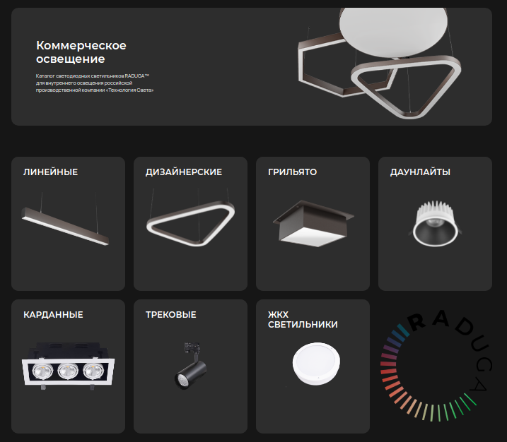 На сайте бренда RADUGA™ компании «Технология Света» проявился раздел коммерческого освещения. В нем представлены самые популярные решения для общего и акцентного света, помогающие создавать комфортную световую среду и качественно презентовать продукцию.