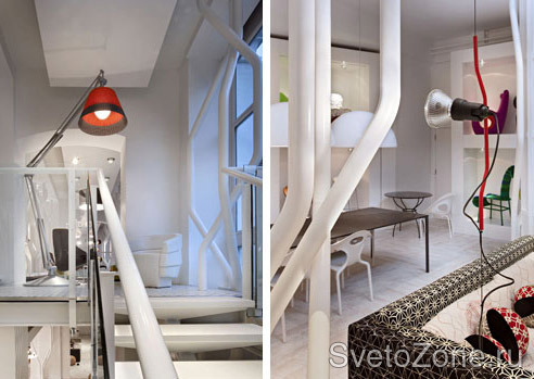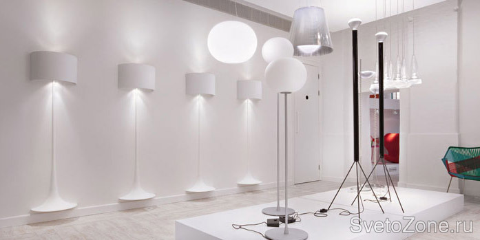 В абсолютно белом пространстве, выполняющем роль театральной сцены, светильники и мебель выступают в роли идеальных актеров, наполняют пространство светом и скульптурными формами.
