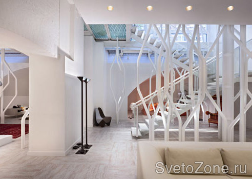 Алюминиевые трубы, окрашенные в белый цвет и напоминающие своими изгибами изогнутые стволы мангровых деревьев, визуально разграничивают пространство шоу-рума на отдельные площадки.