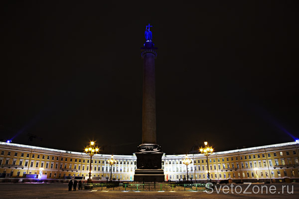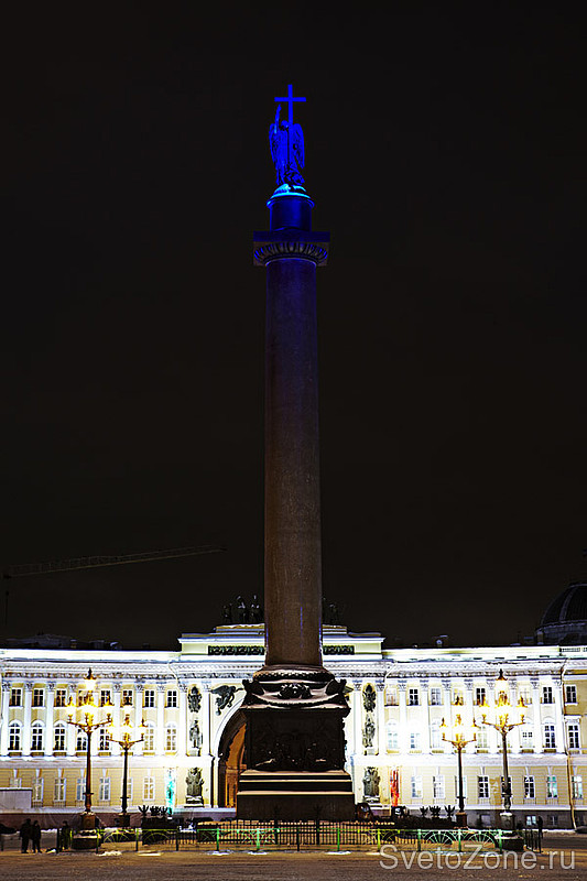 Проект архитектурного освещения Александровской колонны, одного из символов Санкт-Петербурга, осуществлен Philips совместно со специалистами СПб ГУП «Ленсвет». В новой подсветке использованы новейшие светодиодные прожекторы высокой мощности СolorReach, позволяющие эффективно освещать памятник в ночное время суток при максимально рациональном расходе электроэнергии. Энергопотребление сократится на 70%. Благодаря развитию технологий впервые удалось осветить колонну именно так, как было задумано при ее создании: в ночное время светодиодные прожекторы направлены на фигуру ангела, который буквально парит над северной столицей. При этом сама колонна не подсвечивается и дополнительные световые акценты отсутствуют. В будние дни колонна освещается в статичном режиме теплым белым светом. Для праздничных дней специалисты Philips и СПб ГУП «Ленсвет» подготовили сценарий зрелищного светового действа со сменой цвета и интенсивности освещения. Мягкие пастельные тона фиолетового, синего, алого и желтого цветов, то загораясь, то угасая, будут усиливать игру света и тени.