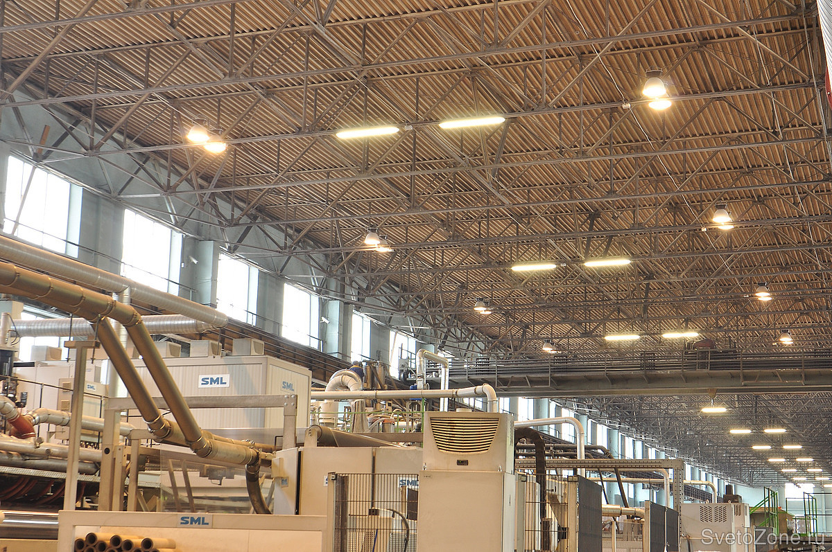 Всего в результате модернизации освещения было установлено более 170 светильников. Для основного освещения были выбраны светильники для высоких пролетов серии Cabana с металлогалогенными лампами HPI-Plus 400 Вт, которые позволяют увеличить световой поток на 30%. Также были использованы люминесцентные светильники с аварийным блоком TCW216 . В рамках данного проекта производственное и монтажное подразделения RS Group осуществили сборку щитов освещения и прокладку кабельных трасс.