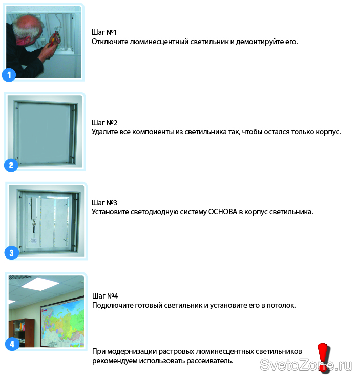 С помощью светодиодной системы «ОСНОВА» модернизировать старое люминисцентное освещение можно всего в несколько шагов: