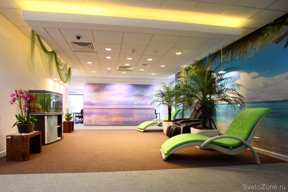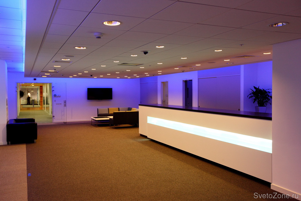 Основной целью в дизайне интерьера было создание комфортных и вдохновляющих световых решений, которые подходят для каждой зоны и дополняют естественное освещение. В офисе есть открытые рабочие пространства с ровным дневным светом, зоны для индивидуальной работы и переговорные комнаты с настраиваемым освещением, зоны для отдыха с разноцветной фоновой подсветкой. Все технологии, использованные в офисе, энергоэффективны. В том числе, во всех помещениях установлены датчики движения, включающие освещение, когда в нем есть необходимость.