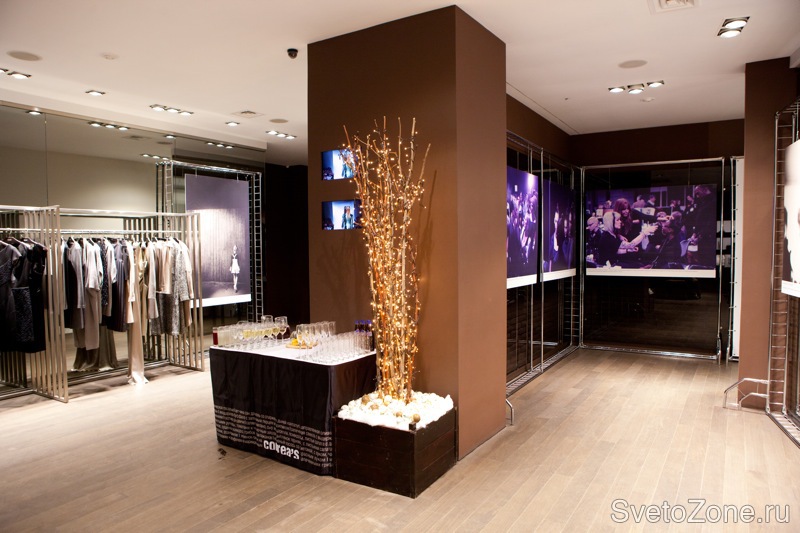 В нишах, где располагается часть коллекций, была установлена светодиодная подсветка eWprofile. В сочетании с темными матовыми стенами футуристический белый свет создает ощущение «парения» моделей. Расположенные в витрине манекены подсвечены акцентным освещением, буквально выхватывающим их из темноты, и привлекающим максимальное внимание к деталям. В торговом пространстве были использованы идеально подходящие для бутика металлогалогенные лампы MasterColour, ведь они дают яркий и искрящийся свет, не вызывающий выцветание тканей. А их сравнительно низкая теплоотдача повышает комфорт покупателей и персонала.