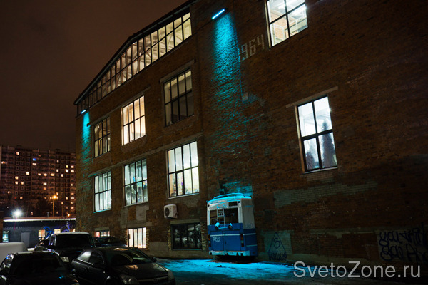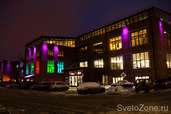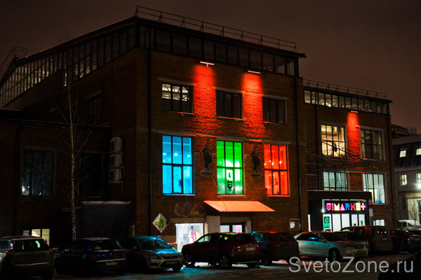 Проектирование и монтаж оборудования осуществлены компанией ООО "МДМ-Лайт". При разработке проекта необходимо было не только привлечь внимание к зданию, подчеркнув особенности творческого подхода к оформлению офисных помещений, но и сделать акцент на фактуре кирпичной кладки фасада (это было одним из условий заказчика). Наиболее оптимальным вариантом в данном случае специалисты компании посчитали использование светодиодных RGB светильников.