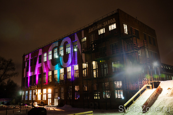 Идея проекта заключается в контрастном сочетании аскетичности индустриальной архитектуры зданий завода и яркой, цветной подсветки фасада. Для воплощения этой идеи в жизнь было использовано оборудование производства IntiLED. С помощью линейных светодиодных светильников IntiLINE реализуется подсветка фрагментов фасада, создающая причудливые сочетания светотеней, а мощные прожекторы IntiRAY создают цветовые акценты на логотипе дизайн-завода. Все светильники оснащены системой RGB, обеспечивающей высокую насыщенность цветов. Управление с помощью ПК позволяет задавать любые сценарии светодиодной подсветки, состоящие из различных световых эффектов.