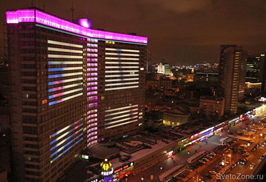 При разработке освещения учитывались особенности и характер каждой из улицы. На Тверской и Проспекте Мира подсветкой светлых оттенков были подчеркнуты барельефы, фронтоны, пилястры и другие архитектурные элементы зданий. Таким образом, в темное время суток фасады выглядят объемными и нарядными. Кроме этого, освещение зданий объединено в одну систему управления и синхронизировано.