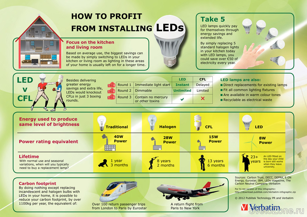 В настоящее время на освещение тратится до 19% всего объема производимой электроэнергии. Полный переход на светодиодное освещение может уменьшить потребление энергии для освещения на 40% во всем мире и уменьшить эксплуатационные расходы приблизительно на 130 миллиардов Евро. Это соответствует ежегодному уменьшению выбросов углекислого газа в атмосферу на 670 миллионов тонн, согласно исследованиям Climate Group. Это примерно эквивалентно уровню выбросов CO2, от всех авиарейсов, выполненных авиакомпаниями по всему миру в 2011 году.