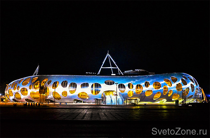 При проектировании и строительстве "Борисов-Арены" применялся исключительно европейский подход с большим количеством индивидуальных решений. Строжайшие требования предъявлялись и к световому оборудованию: под европейские критерии высокого качества исполнения, светотехнических характеристик, экономичности и энергоэффективности полностью подошли светодиодные светильники IntiLED. Более 50 мощных RGBW прожекторов серии IntiSTARK были использованы для равномерной динамической подсветки фасада стадиона с опор. Высокая степень защиты от внешних воздействий IP66 и широкий температурный диапазон от -40 до +45°С делают прожекторы серии IntiSTARK универсальным решением для заливающего освещения больших площадей и спортивных объектов. Светодиодное оборудование, используемое в проекте освещения «Борисов-Арены», отвечает последним требованиям энергоэффективности и позволяет снизить расходы на техническое обслуживание благодаря долгому сроку службы.