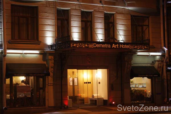 В конце 2011 года осуществлена архитектурная подсветка гостиницы "Арт Отель Деметра". Отель располагается в центре Санкт-Петербурга в историческом здании, возведенном в самом начале ХХ века. Перед открытием гостиницы Art Otel Demetra были произведены масштабные реставрационные работы. По сохранившимся чертежам специалистами компании "Деметра" были восстановлены утраченные элементы фасадов, в том числе и скульптурные группы. Здание признано архитектурным памятником города. Поэтому при проектировании освещения фасадов было особенно важно максимально деликатно вписать светодиодные светильники в архитектурное пространство строения. Использованные в проекте светильники серий IntiROLL, IntiRAY и IntiLINE успешно справились с этой задачей. Установленные под балконами, прожекторы IntiRAY освещают эркерную зону здания. Статуи на крыше подсвечены с фасада несколькими светильниками IntiROLL со специальными удлинёнными кронштейнами. Контур первого этажа обозначен линейными светодиодными светильниками серии IntiLINE производства "IntiLED". Проект архитектурной подсветки выполнен компанией "Театрально Техническая Корпорация".