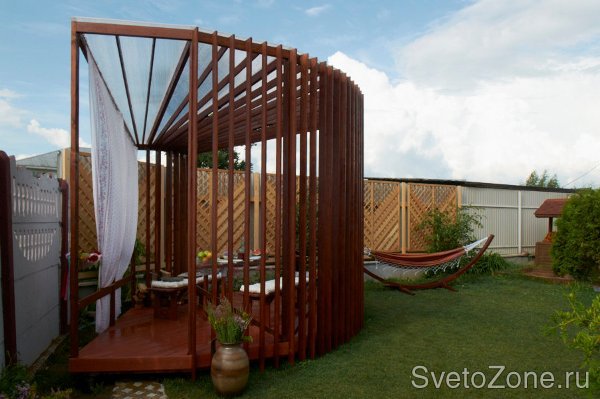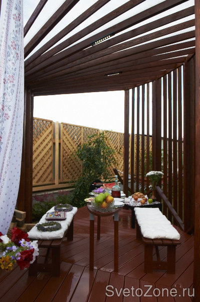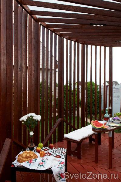 Передача "Фазенда - Беседка-веер" от 10 июля 2011 года. Задумка дизайнера - светодиодное точечное освещение, но светильники узкие, не выходящие за размеры ширины деревянной балки. ООО Иллюминекс изготовил индивидуальные светильники на основе светодиодного светильника ССП-14-02 (ООО Иллюминекс).