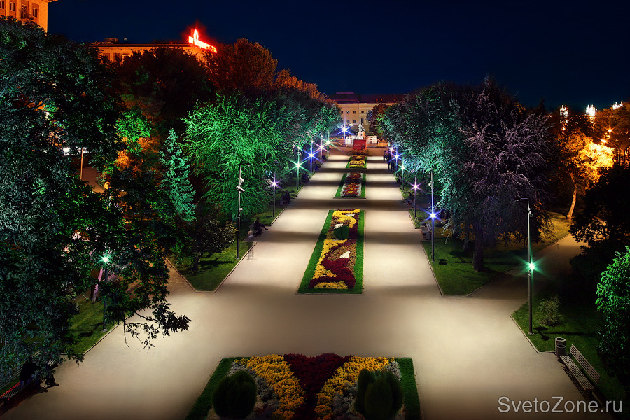 Концепция освещения: Парк Победы на набережной, традиционное и излюбленное место отдыха Волгоградцев и гостей города. Ко Дню города в 2009 году была проведена реконструкция освещения в парке. Полностью заменены все опоры и установлены новые светильники и система управления освещением.