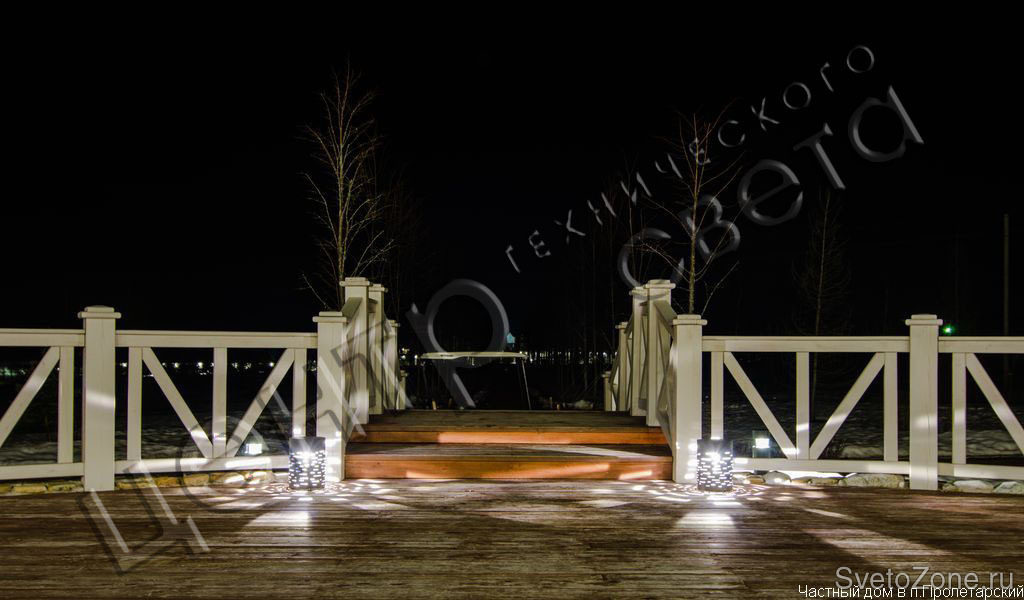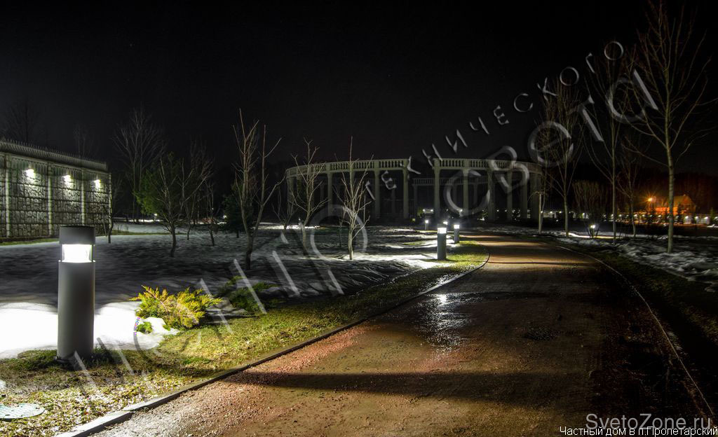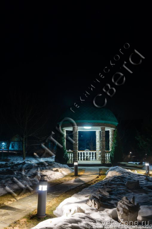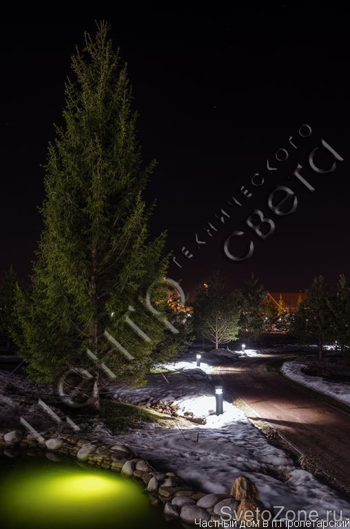 Продукция Ares прекрасно подошла для данного объекта. В подсветке архитектурной композиции нашли свое применение светильники: Vanna - освещение фасада ,без засветки внутреннего помещения, Zhora - (новинка от Ares) - создание декоративного света, Silvia - оригинальное освещение дорожек, Martina, Gemma и другие.