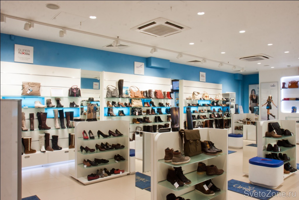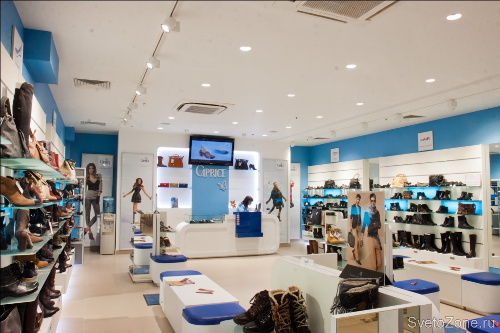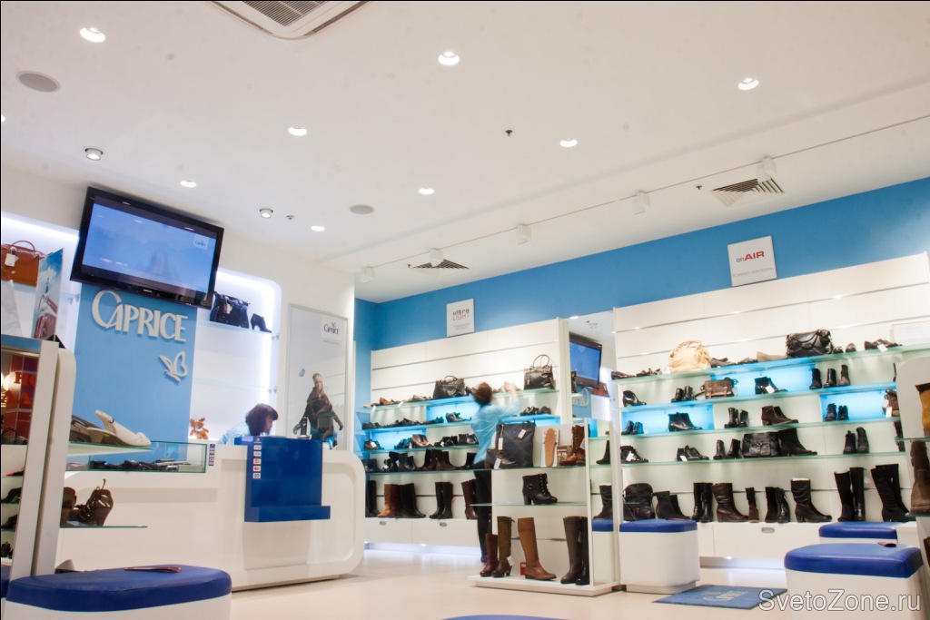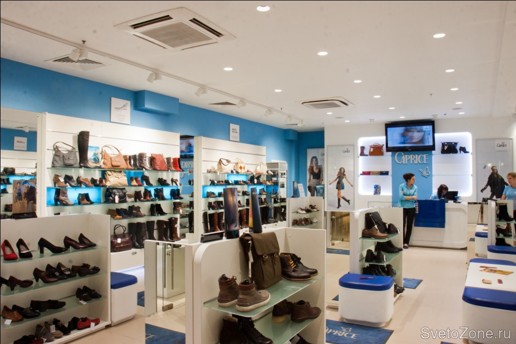 Общая концепция развития торговой марки Caprice «Прогулка по воздуху» (Walking on air) отражается в оформлении интерьера всех магазинов сети в фирменной бело-голубой гамме. Ее воплощением в освещении стало обилие яркого белого света множества металлогалогенных ламп, который позволил создать в помещении магазина особую, «воздушную» атмосферу.