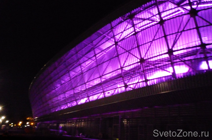 Здание ККЦ представляет собой овальный стадион с фасадом из металлоконструкций серо-белого цвета, тонированным витражным остеклением. Для подсветки олимпийского объекта были выбраны линейные светодиодные светильники производства компании "IntiLED". В проекте архитектурного освещения использовано 700 метровых RGB светильников серии IntiLINE, создающих световую «заливку» фасада. А установленная на объекте система управления освещением IntiLED позволяет создавать на фасаде различные световые эффекты. Управление светодиодными светильниками в данном случае осуществляется по стандартному протоколу DMX-512.