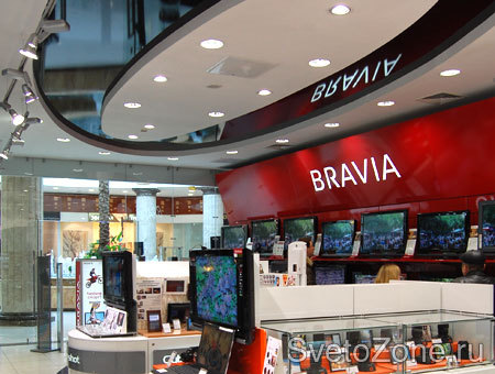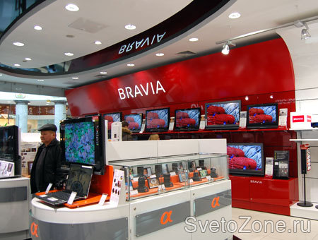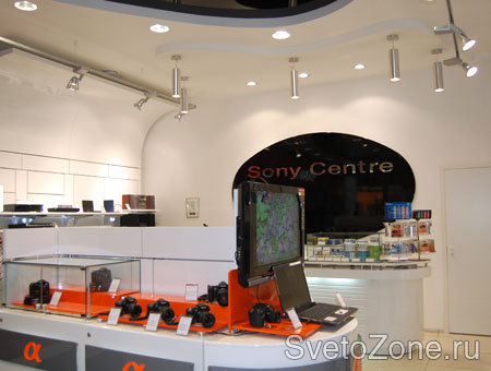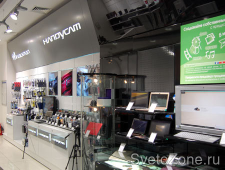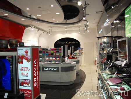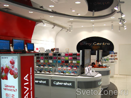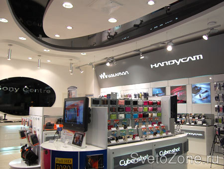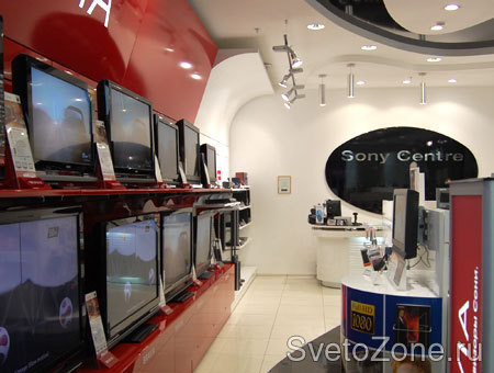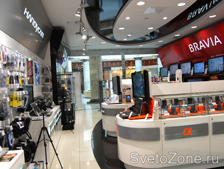 Все пространство магазинов делится на зоны, каждая из которых принадлежит определенной марке Sony: телевизоры BRAVIA, ноутбуки, фотоаппараты Cyber-shot, flash плееры Walkman. Такое разграничение позволяет клиентам быстро сориентироваться в торговом зале и сделать свой выбор.