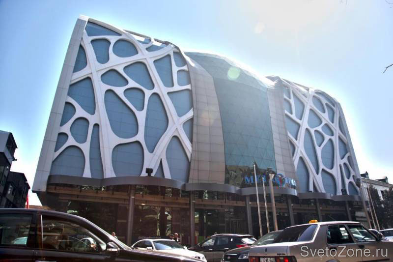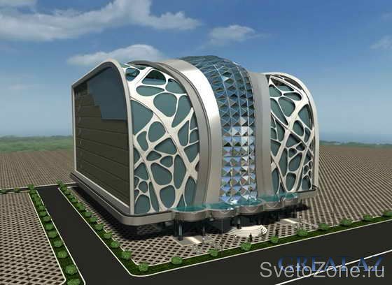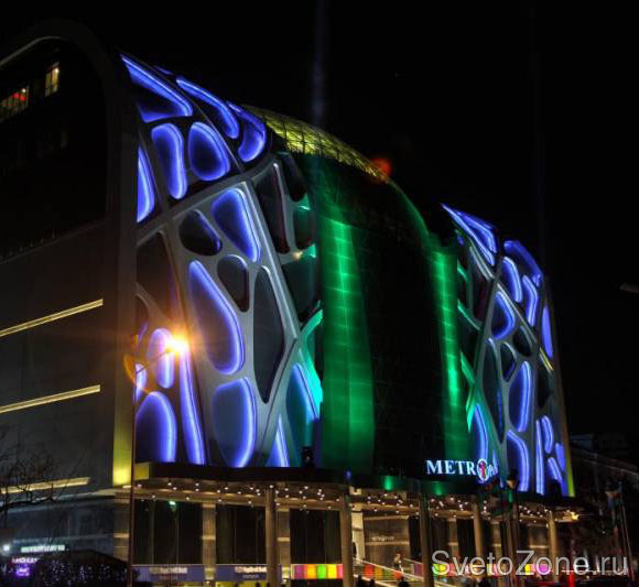 Фасад здания исполнен в стиле авангардизма и благодаря своей необычной архитектуре несомненно является одной из доминант городского ландшафта. В целях создания привлекательного внешнего вида в темное время суток, импозантный дизайн строения потребовал разработки нестандартной концепции освещения. Инновационное световое решение сочетает использование цвета и необычный подход к выделению светом малых форм. Напоминающий огромные мыльные пузыри, заключенные в искусно вырезанные гигантским лобзиком ниши, шаблон симметрично репродуцирован по всей фронтальной поверхности фасада и по своему замыслу призван воссоздать эффект трепещущей цветовой игры движущейся мыльной жидкости.