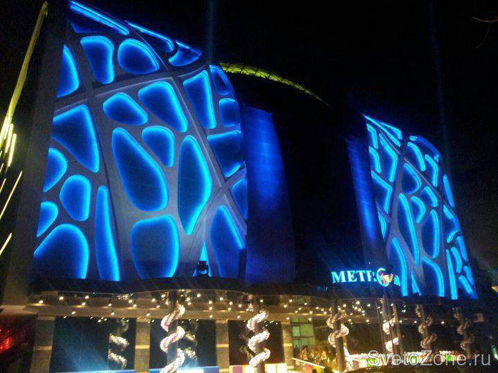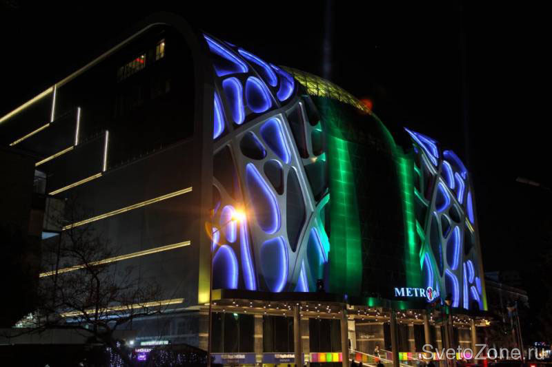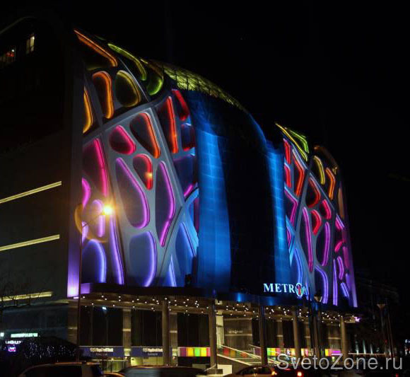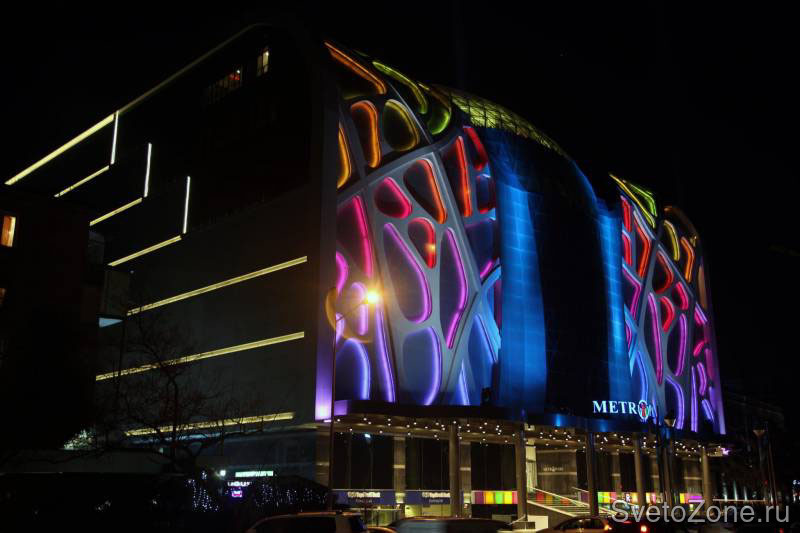 Для реализации идеи использованы гибкие энергоэффективные светодиодные изделия GRIVEN LooseLED RGB, представляющие собой гибкую светодиодную ленту, смонтированную в защитном IP65 гибком ПВХ профиле. Светодиодная лента по периметру опоясывает нишу каждого из фреймов и проложена в специальном углублении, скрывающем источники света и предотвращающем эффект ослепления. Плотность светодиодных кластеров составляет 40 точек на метр длины. В общей сложности для инсталляции использовано 650 метров ленты LooseLED RGB с сопутствующим коммутационным оборудованием. Полученный визуальный эффект представляет собой динамичную игру селективных цветов, достаточно реалистично соответствует концепции и в значительной степени оживляет футуристический фасад на фоне темного неба. |